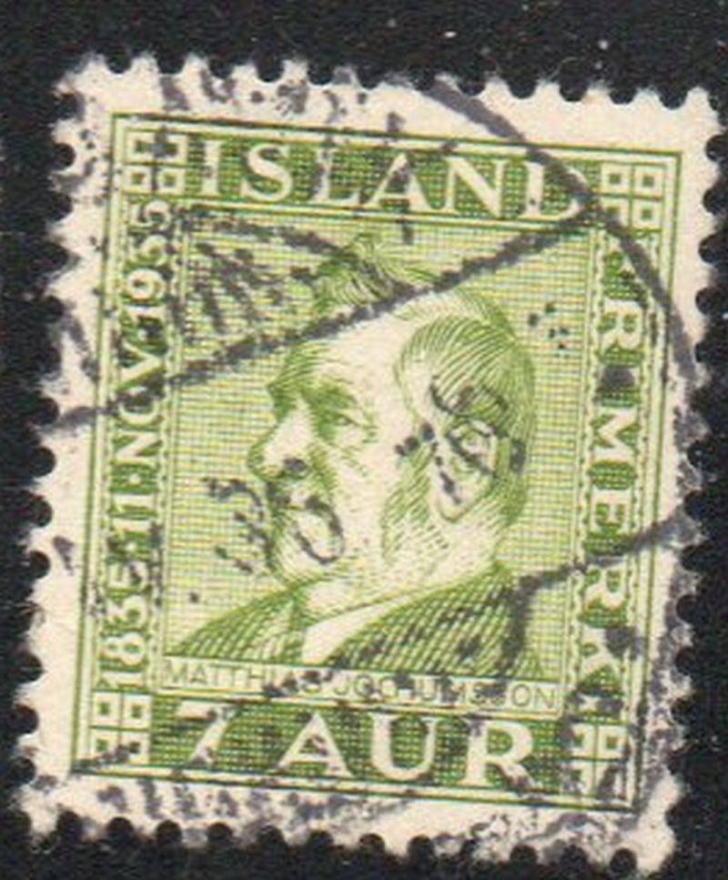 Iceland Scott Catalogue number 197 1935 7 aur yellow green Jochumsson stamp.Used, fine.Member Canadian Stamp Dealers Association .Canadian Customers - I pay the GST/HST on your purchases from me .25-2-112.jpg