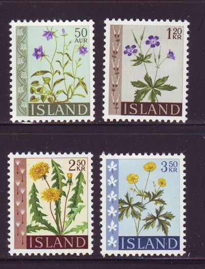 Iceland Scott Catalogue number 329-332 1960 Flowers stamp set .Mint, fine to very fine, original gum never hinged . Member Canadian Stamp Dealers Association . Canadian Customers - I pay the GST/HST on your purchases from me .