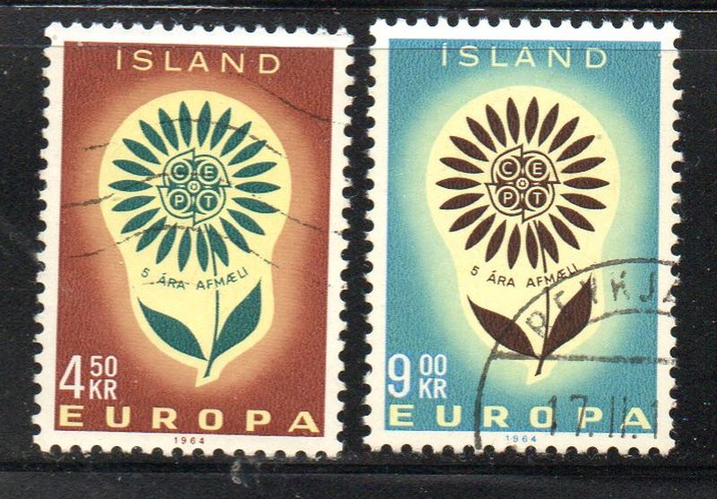 Iceland Scott Catalogue number 367-368 1964 Europa stamp set .Used, fine to very fine . Member Canadian Stamp Dealers Association . Canadian Customers - I pay the GST/HST on your purchases from me .