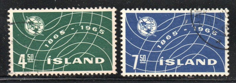 Iceland Scott Catalogue number 370-371 1965 100th Anniversary ITU stamp set .Used, fine to very fine . Member Canadian Stamp Dealers Association . Canadian Customers - I pay the GST/HST on your purchases from me .