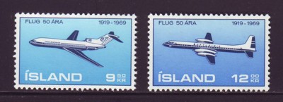 Iceland  Scott Catalogue number 410-411  1969 50th Anniversary Icelandic Aviation stamp set .Mint, fine to very fine, original gum never hinged . Member Canadian Stamp Dealers Association . Canadian Customers - I pay the GST/HST on your purchases from me .