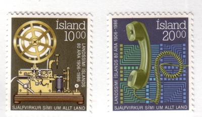 Iceland Scott Catalogue number 632-633 1986 80th Anniversary Telephones in Iceland stamp set ..Mint, fine to very fine, original gum never hinged.Member Canadian Stamp Dealers Association .Free Shipping on purchases over $50 going to North America.Canadian Customers - I pay the GST/HST on your purchases from me .