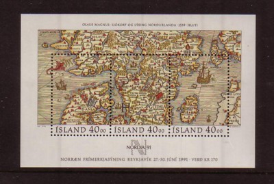 Iceland Scott Catalogue number 715 1990  NORDIA 91 Philatelic Exhibition, Old Map,  stamp souvenir  sheet . Mint, fine to very fine, original gum never hinged .Member Canadian Stamp Dealers Association .Free Shipping on purchases over $50 going to Canada or the USA .Canadian Customers - I pay the GST/HST on your purchases from me .