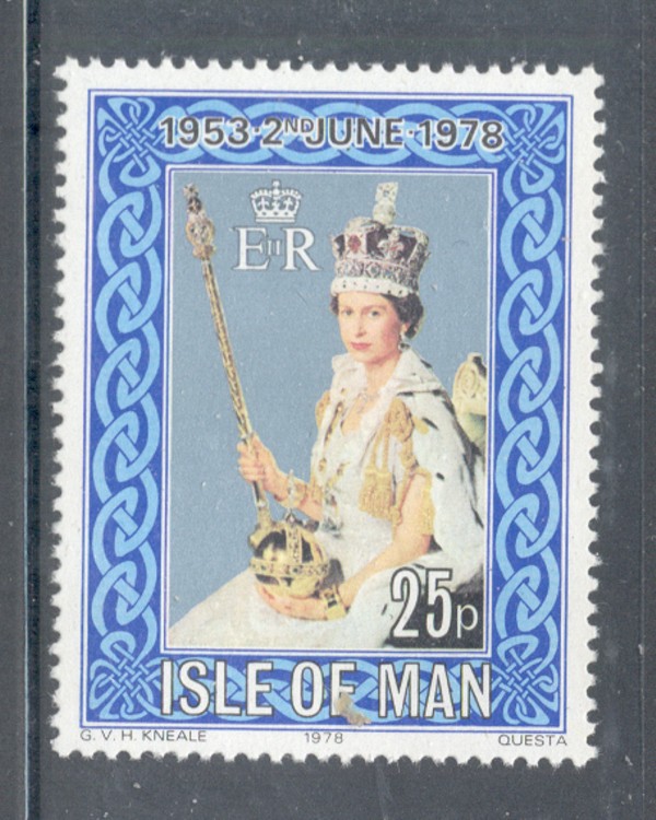Isle of Man  Scott Catalogue number 130 1978 25thh Anniversary Coronation of QE II stamp .Mint, fine to very fine, original gum never hinged .Member Canadian Stamp Dealers Association . Free Shipping on purchases over $50 going to North America . Canadian Customers - I pay the GST/HST on your purchases from me