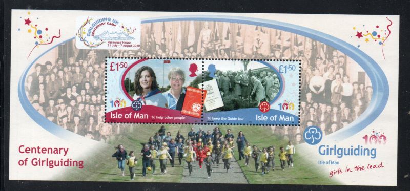 Isle of Man Scott Catalogue number 1365b 2010 100th Anniversary Girl Guides stamp souvenir sheet with Camp overprint on selvedge .Mint, fine to very fine, original gum never hinged.Canadian Customers - no added GST/HSTUS customers - No tariffs on stamps sent by meMember Canadian Stamp Dealers Association