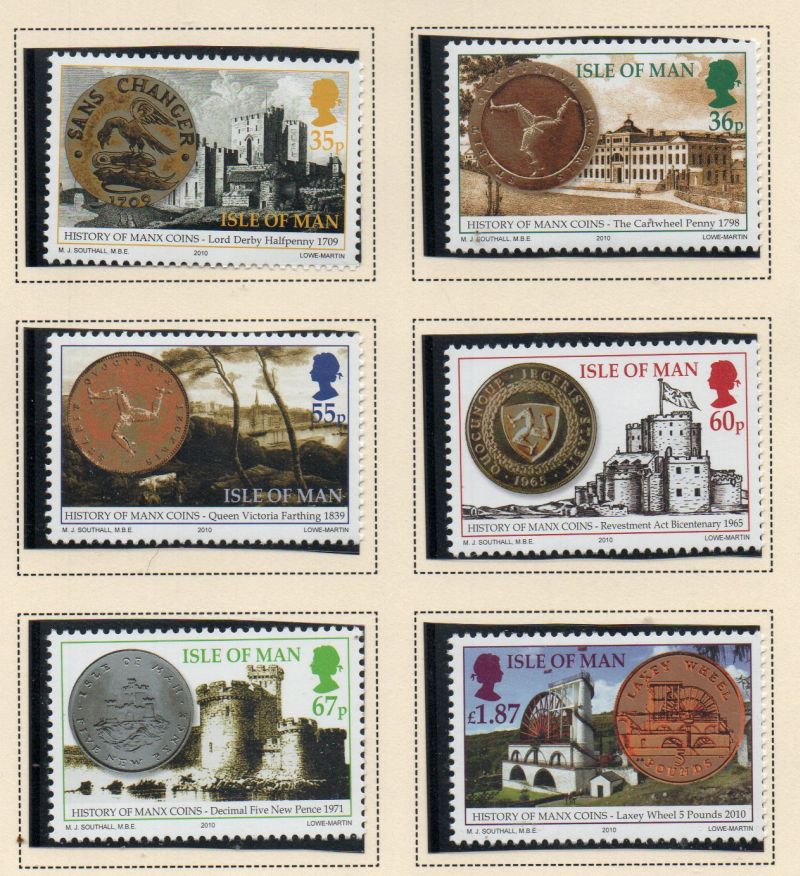 Isle of Man Scott Catalogue number 1387-1392 2010 History of Manx Coinage stamp set .