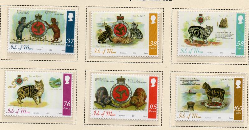 Isle of Man Scott Catalogue number 1442-1447 2011 Manx Cats on Postcards stamp set.