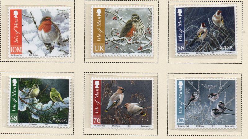 Isle of Man Scott Catalogue number 1455-1460 2011 Birds in Winter stamp set.