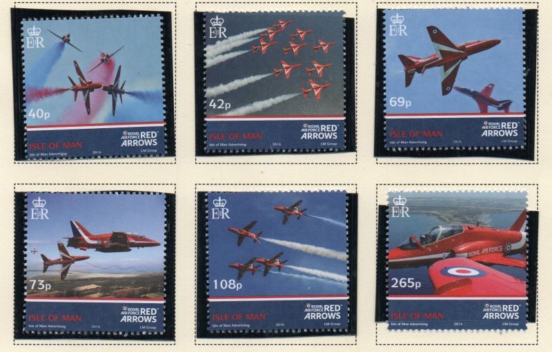 Isle of Man Scott Catalogue number 1627-1632 2014 RAF Red Arrow Aerobatic Team stamp set .Mint, fine to very fine original gum never hinged .Canadian Customers - no added GST/HSTUS customers - No tariffs on stamps sent by meMember Canadian Stamp Dealers Association