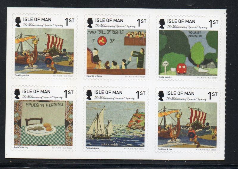 Isle of Man Scott Catalogue number 1715-1719 2015 Millennium of Tynwald Tapestry self adhesive stamp set in block of 6Mint, fine to very fine original gum never hinged  .Canadian Customers - no added GST/HSTUS customers - No tariffs on stamps sent by meMember Canadian Stamp Dealers Association