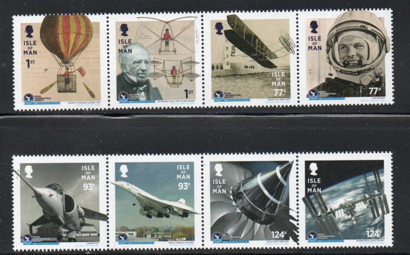 Isle of Man Scott Catalogue number 1764-1765 2016 150th Anniversary Royal Aeronautical Society stamp set strips of 4 .