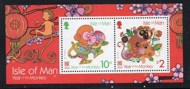 Isle of Man Scott Catalogue number 1766 2016 Year of the Monkey stamp souvenir sheet .