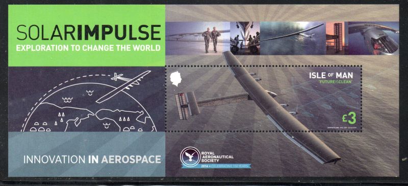 Isle of Man Scott Catalogue number 1835 2016 Circumnavigation by Solar Powered Airplane stamp souvenir sheet .Mint, fine to very fine, original gum never hinged .Canadian Customers - no added GST/HSTUS customers - No tariffs on stamps sent by meMember Canadian Stamp Dealers Association
