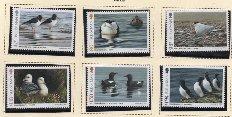 Isle of Man Scott Catalogue number 1880-1885 2017 Birds stamp setMint, fine to very fine, original gum never hinged .Canadian Customers - no added GST/HSTUS customers - No tariffs on stamps sent by meMember Canadian Stamp Dealers Association