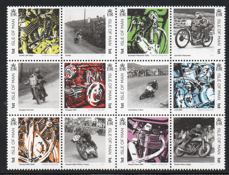 Isle of Man Scott Catalogue number 1948 2018  British Motorcycles  stamp  block of 12Mint, fine to very fine, original gum never hinged .Canadian Customers - no added GST/HSTUS customers - No tariffs on stamps sent by meMember Canadian Stamp Dealers Association