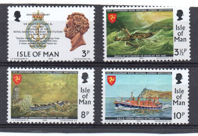 Isle of Man  Scott Catalogue number 36-39 1974 150th Anniversary Royal national Lifeboat Institution stamp set .Mint, fine to very fine, original gum never hinged .Member Canadian Stamp Dealers Association . Free Shipping on purchases over $50 going to North America . Canadian Customers - I pay the GST/HST on your purchases from me