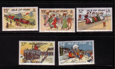 Isle of Man Scott Catalogue number 413-17, 1990 Humourous postcards stamp set.Mint, fine to very fine, original gum never hinged .Canadian Customers - I pay the GST/HST for you