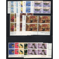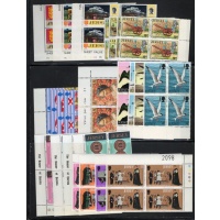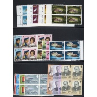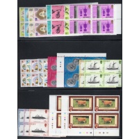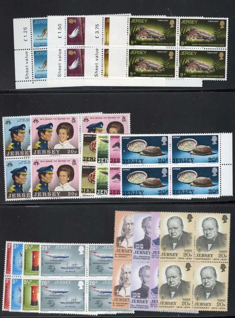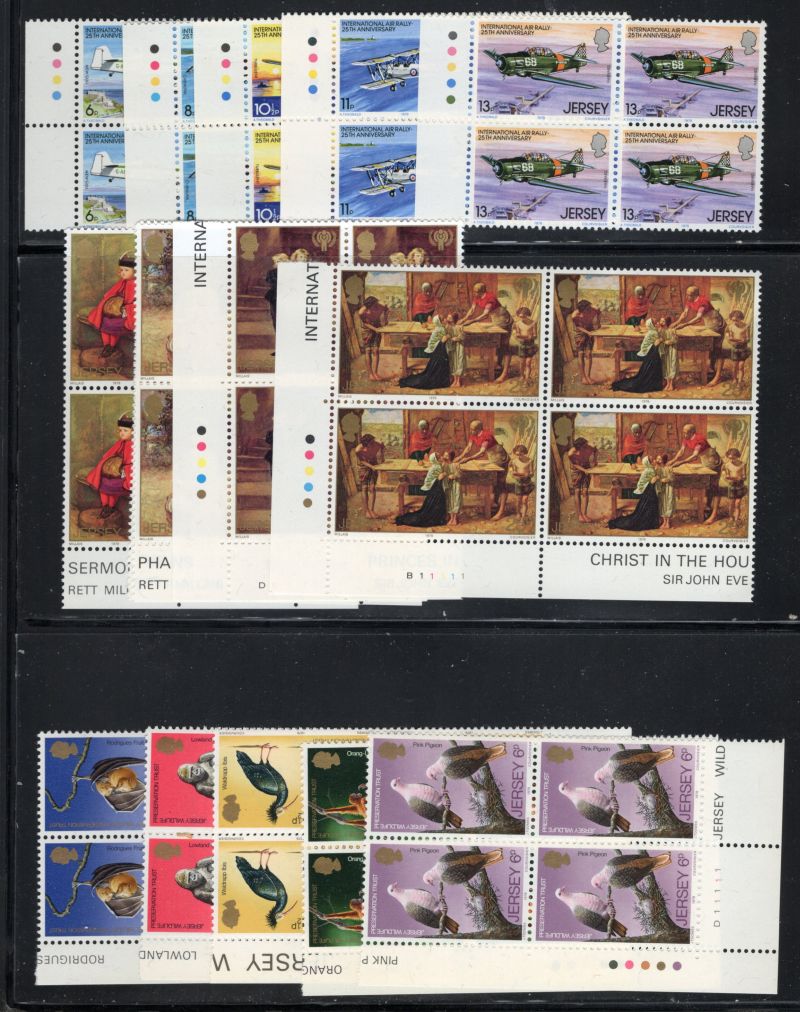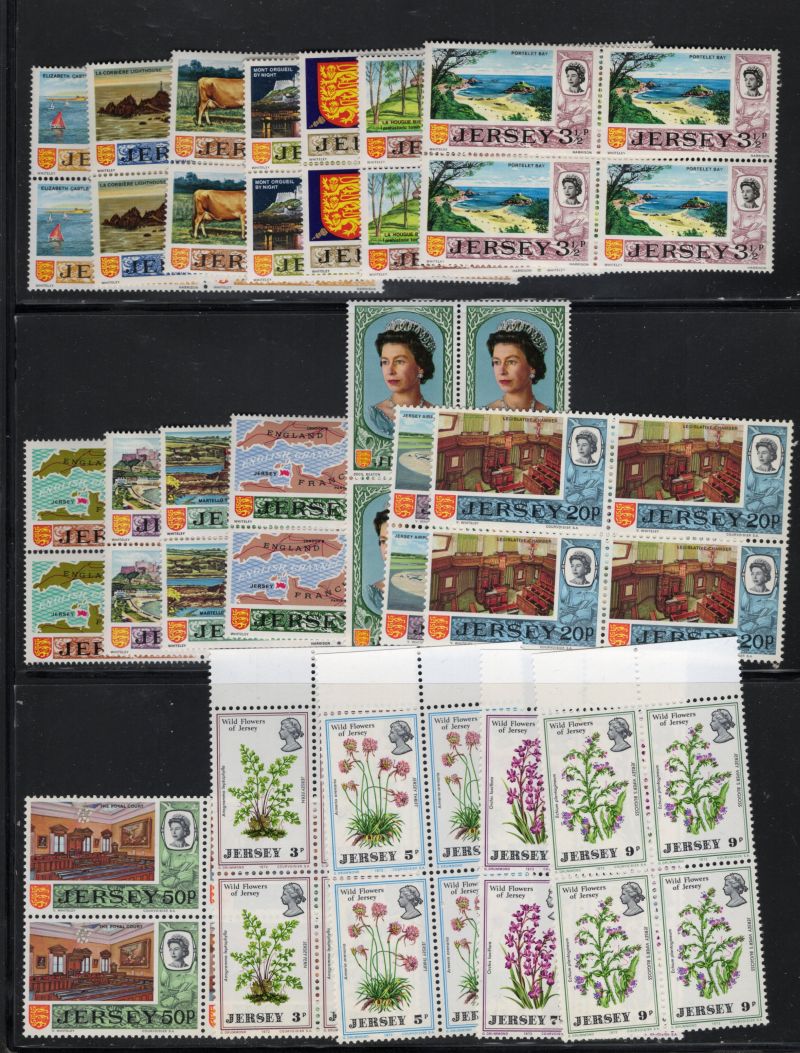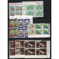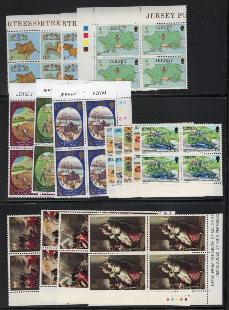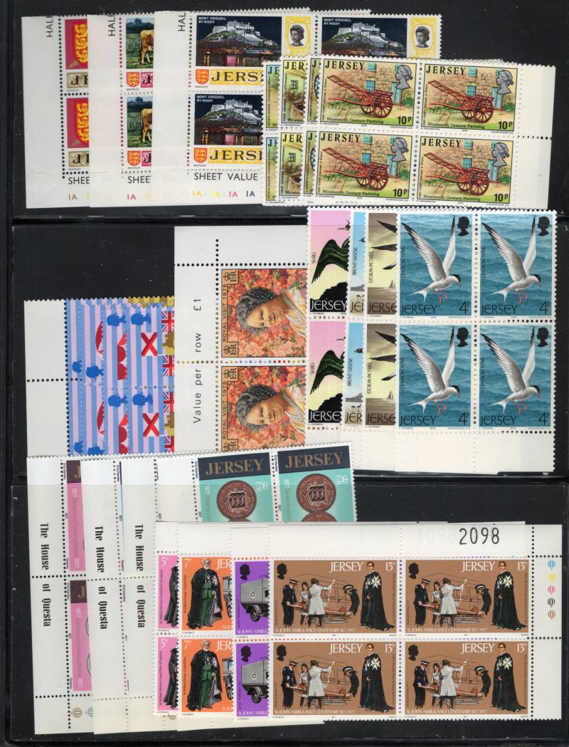 Jersey Scott Catalogue number 34-48,61-64,65-68, 89-90,91-4,98-102,103-06, 107-109,120-23, 124-27,128,129-32,171-74,175-78, 179-182,183-186,190-94,1956-196, 197-201,208-1,213-16, 217-21, 222-25, 226-28, 231-5, & 242- 45 all in blocks of 4 some corner blocks with traffic lights on selvedge.