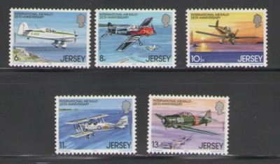 Jersey  Scott Catalogue number  208-212 1979 25th Anniversary International Air Rally stamp set .Mint, fine to very fine, original gum never hinged.Member Canadian Stamp Dealers Association .Free Shipping on purchases over $50 going to North America.Canadian Customers - I pay the GST/HST on your purchases from me .