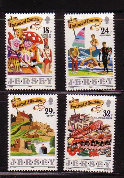 Jersey Scott Catalogue number 536-539 1990 Festival of Tourism stamp set.Mint, fine to very fine, original gum never hinged .Member Canadian Stamp Dealers Association .Free Shipping on purchases over $50 going to North America.Canadian Customers - I pay the GST/HST on your purchases from me .