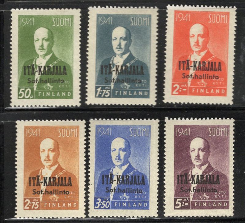 Karelia Finland Scott Catalogue number N22-N27 1942 President Ryti overprinted stamp set.Mint, fine to very fine, original gum hinged.Canadian Customers - no added GST/HSTUS customers - No tariffs on stamps sent by meMember Canadian Stamp Dealers Associationbr26-4-32.jpg