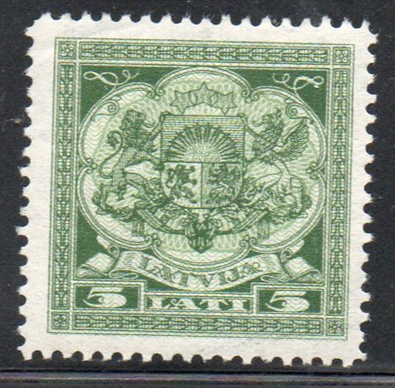 Latvia Scott Catalogue number 130 1923 5 L Coat of Arms stamp .Mint, fine to very fine, original gum hinged . Member Canadian Stamp Dealers Association . Canadian Customers - I pay the GST/HST on your purchases from me .25-5-17jpg
