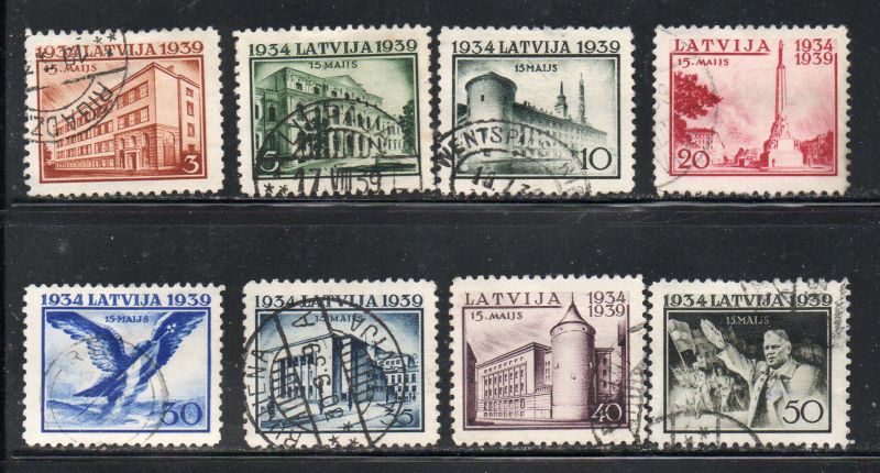 Latvia Scott Catalogue 207-214 1939 5th National Unity Day stamp set.Used, fine to very fine .Member Canadian Stamp Dealers Association .Canadian Customers - I pay the GST/HST on your purchases from me .25-8-61.jpg