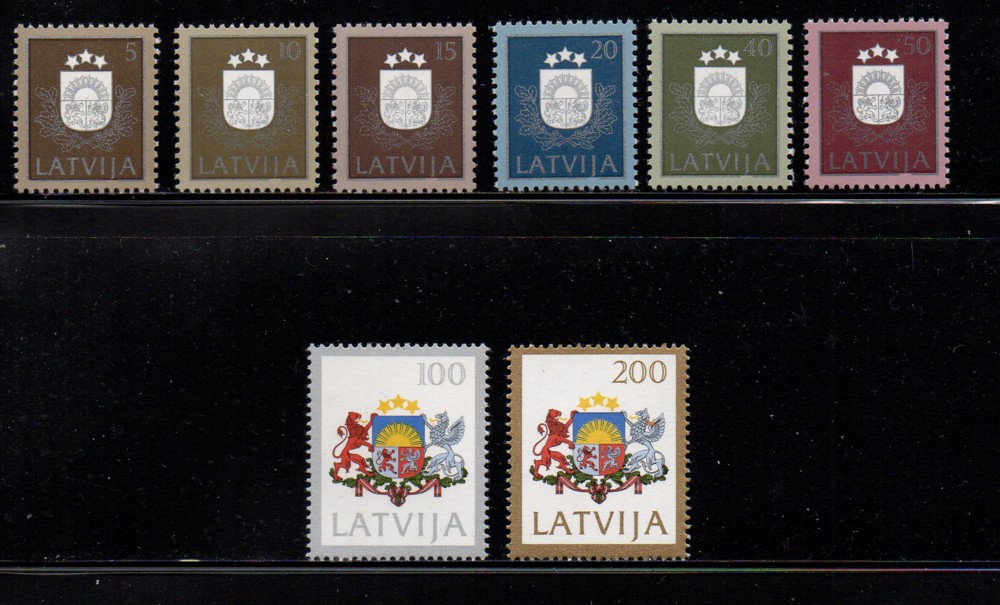 Latvia Scott Catalogue number 300-307 1991 Coat of Arms stamp set .