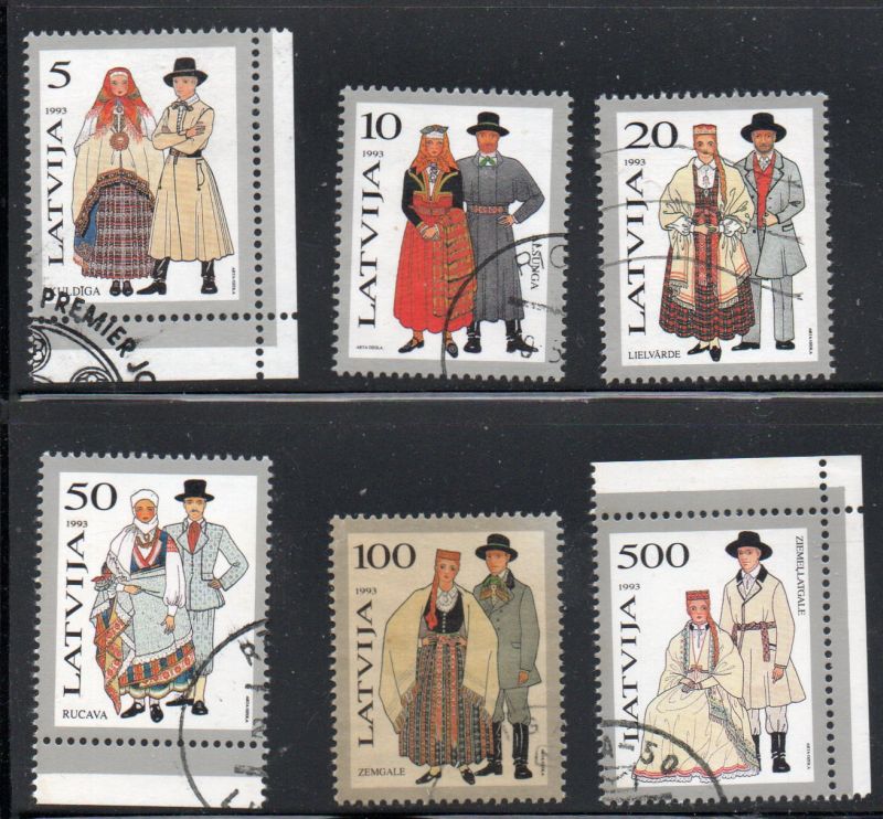Latvia Scott Catalogue number 343-348 1993 Traditional Costumes stamp set ..Used, fine to very fine 100s stained Member Canadian Stamp Dealers Association . Canadian Customers - I pay the GST/HST on your purchases from me .25-6-29.jpg