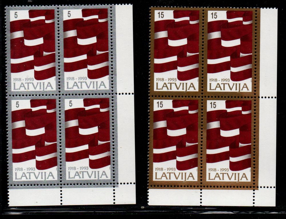 Latvia Scott Catalogue number 353-354 1993 75th Anniversary Independence stamp set in blocks of 4