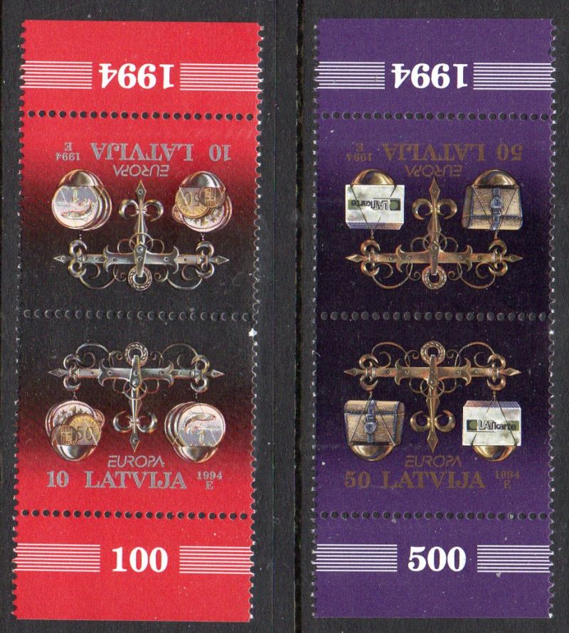 Latvia Scott Catalogue number 379a-380a 1994 Europa stamp set in tete-beche pairs .Mint, fine to very fine, original gum never hinged .Member Canadian Stamp Dealers Association .Canadian Customers - I pay the GST/HST on your purchases from me .