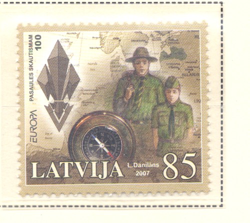 Latvia Scott Catalogue number 677 2007 Europa, Boy Scout Anniversary, stamp .Mint, fine to very fine, original gum never hinged .Member Canadian Stamp Dealers Association .Canadian Customers - I pay the GST/HST on your purchases from me .