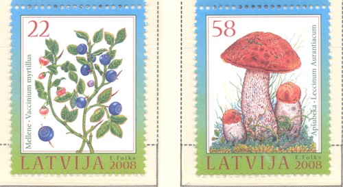 Latvia Scott Catalogue number 715-716 2008 Berries & Mushrooms stamp set .Mint, fine to very fine original gum never hinged .Canadian Customers - no added GST/HSTUS customers - No tariffs on stamps sent by meMember Canadian Stamp Dealers Association