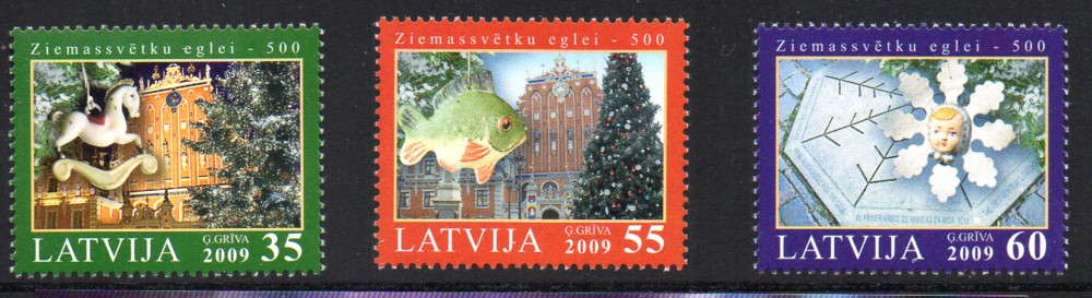Latvia Scott Catalogue number 7750-752 2009 Christmas stamp set .Mint, fine to very fine, original gum never hinged .Canadian Customers - no added GST/HSTUS customers - No tariffs on stamps sent by meMember Canadian Stamp Dealers Association