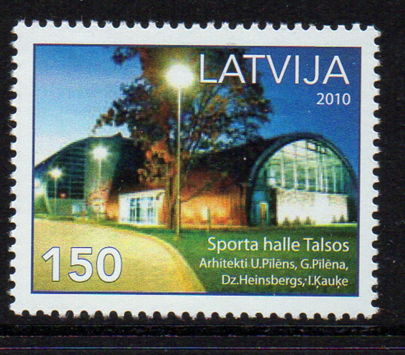 Latvia Scott Catalogue number 765 2010 Talsos Sports Hall stamp .Mint, fine to very fine original gum never hinged .Canadian Customers - no added GST/HSTUS customers - No tariffs on stamps sent by meMember Canadian Stamp Dealers Association