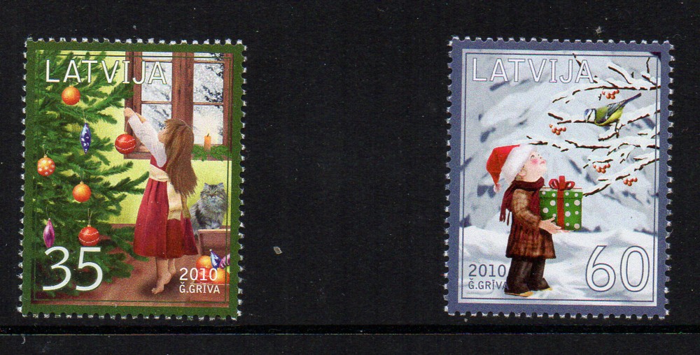 Latvia Scott Catalogue number 773-774 2010 Christmas stamp set .Mint, fine to very fine original gum never hinged .Canadian Customers - no added GST/HSTUS customers - No tariffs on stamps sent by meMember Canadian Stamp Dealers Association