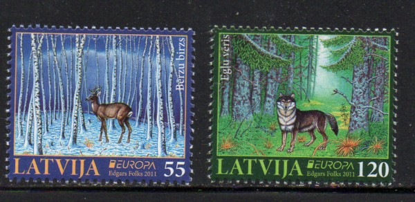 Latvia Scott Catalogue number 779-780 2011 Europa, Forest Animals, stamp set .Mint, fine to very fine original gum never hinged .Canadian Customers - no added GST/HSTUS customers - No tariffs on stamps sent by meMember Canadian Stamp Dealers Association