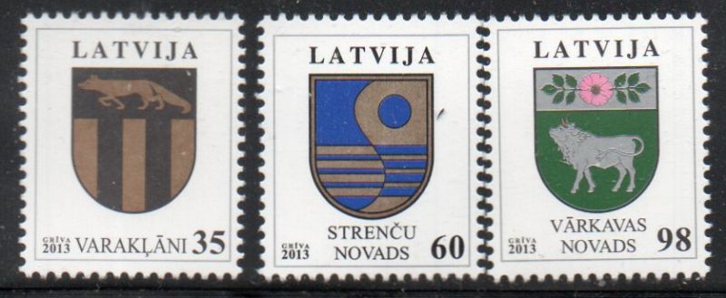 Latvia Scott Catalogue number 824-826 2013 Coats of Arms stamp set.Mint, fine to very fine original gum never hinged .Canadian Customers - no added GST/HSTUS customers - No tariffs on stamps sent by meMember Canadian Stamp Dealers Association
