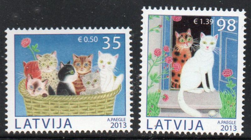 Latvia Scott Catalogue number 837-838 2013 Cats stamp set .Mint, fine to very fine original gum never hinged .Canadian Customers - no added GST/HSTUS customers - No tariffs on stamps sent by meMember Canadian Stamp Dealers Association