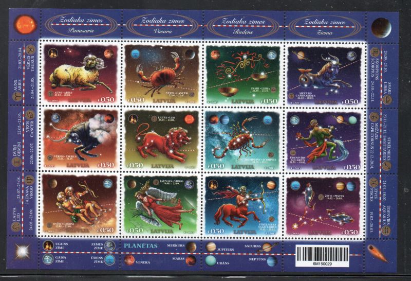 Latvia Scott Catalogue number 916 2015 Signs of the Zodiac stamp sheet .Mint, fine to very fine, original gum never hinged .Member Canadian Stamp Dealers Association .Canadian Customers - No added GST/HST .US customers - There is no tariff on postage stamps that I send to you.