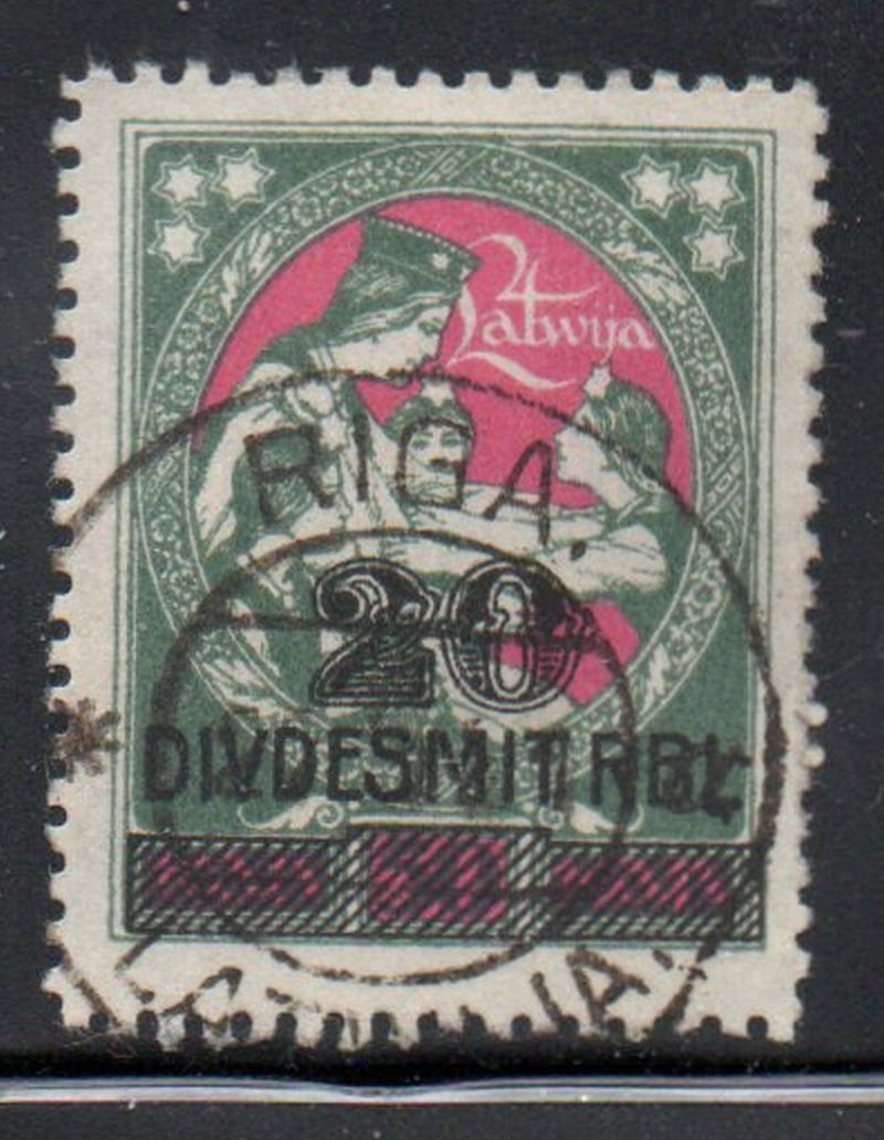 Latvia Scott Catalogue number 96 1921 20 R overprint on 50 k Lartgale Relief stamp .Used, Member Canadian Stamp Dealers Association . Canadian Customers - I pay the GST/HST on your purchases from me .25-6-26.jpg