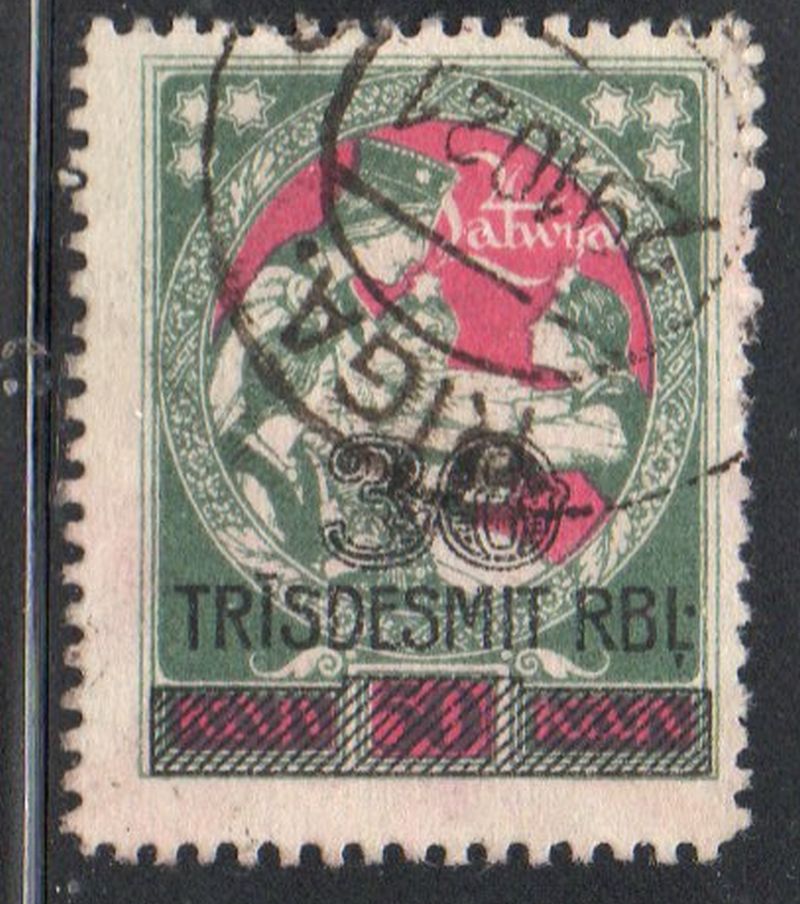 Latvia Scott Catalogue number 97 1921 30 R overprint on 50 k Lartgale Relief stamp .Used, fine o fine plus . Member Canadian Stamp Dealers Association . Canadian Customers - I pay the GST/HST on your purchases from me .25-5-11.jpg