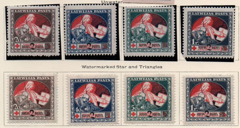 Latvia Scott Catalogue number B13-B20 1921 Wounded Soldiers stamp set, 2 r surcharge .