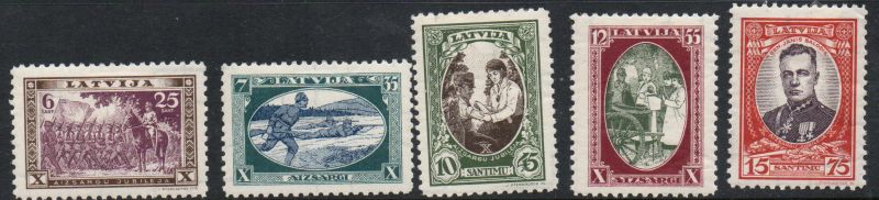 Latvia Scott Catalogue number B87-B91 1932, surcharge for Home Guards, stamp set .