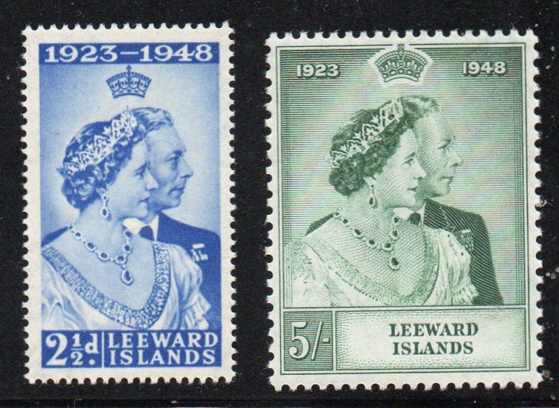 Leeward Islands Scott Catalogue number 118-119 1949 Silver Wedding Anniversary George VI & Elizabeth stamp set .Mint,  fine to very fine, original gum hinged .Member Canadian Stamp Dealers Association . Canadian Customers - I pay the GST/HST on your purchases from me .25-7-53.jpg