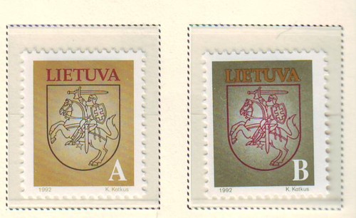 Lithuania Scott Catalogue number 459-460 1993 A & B Arms stamp set .Mint, fine to very fine original gum never hinged .Canadian Customers - I pay the GST/HST on your purchases from me .