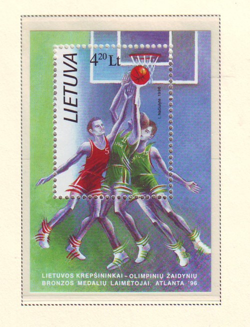 Lithuania  Scott Catalogue number 557 1996 Lithuanian Olympic Basketball |Team Bronze Medal Winners stamp souvenir sheet .Mint, fine to very fine original gum never hinged  .Member Canadian Stamp Dealers Association .Canadian Customers - I pay the GST/HST on your purchases from me .