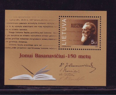 Lithuania Scott Catalogue number 709 2001 Jonas Basanavicius stamp souvenir sheet .