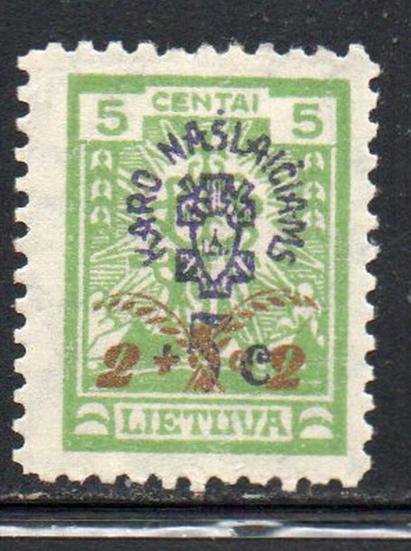 Lithuania Scott Catalogue number B19 1926 2c + 2c War Invalids surcharge stamp.Mint, fine original gum hinged .Canadian Customers - I pay the GST/HST on your purchases from me .25-12-8.jpg