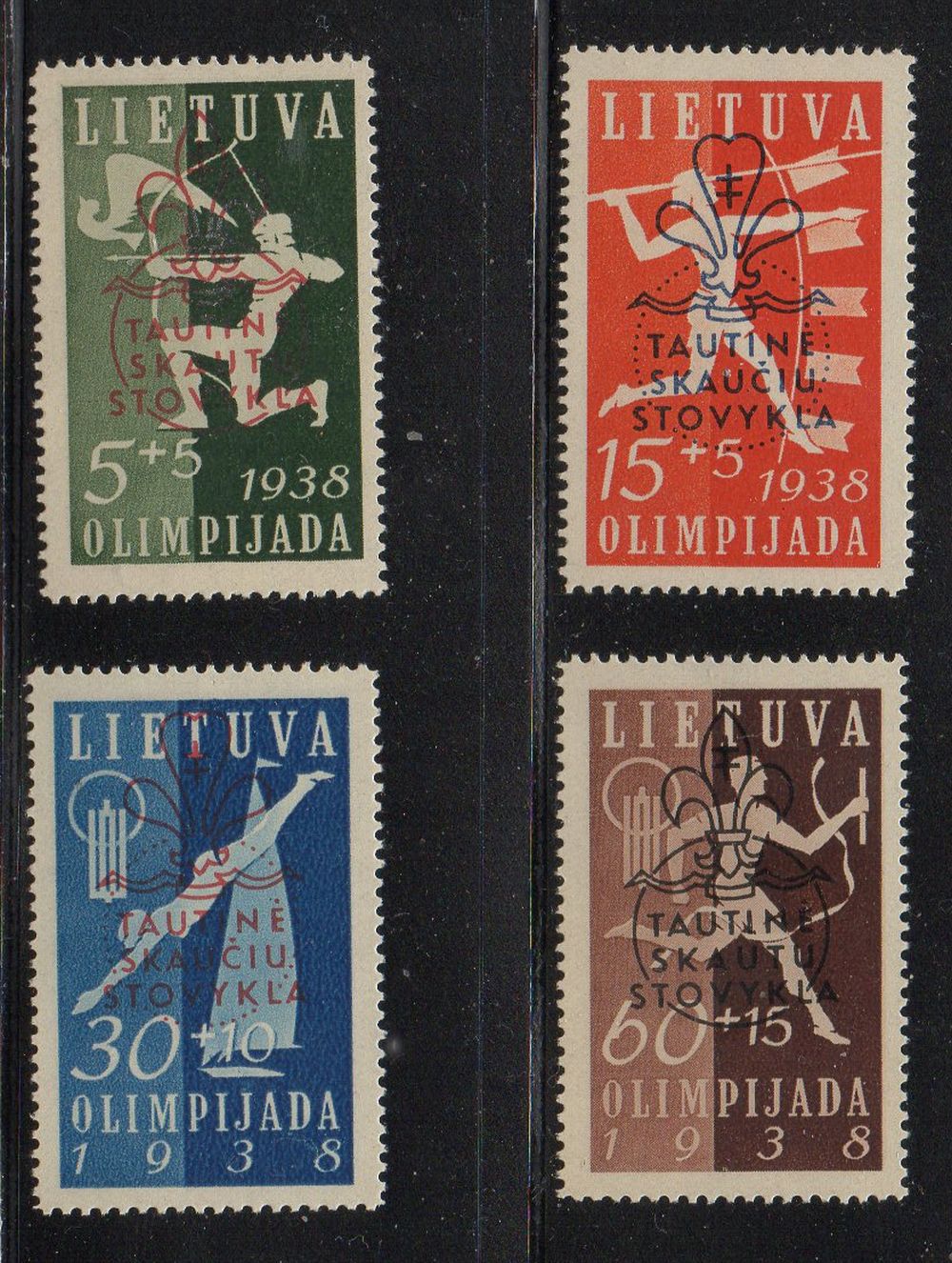 Lithuania Scott Catalogue number B47-B50 1938 Olympiad stamp set overprinted for Scout Jamboree .Mint, fine to very fine, original gum hinged . Member Canadian Stamp Dealers Association .Canadian Customers - I pay the GST/HST on your purchases from me .